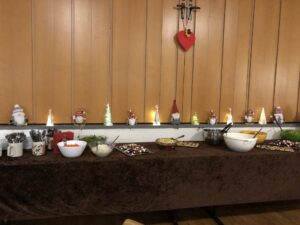 Im Anschluss wurden wir in den adventlich geschmückten Gemeindesaal geladen, wo wir mit einem reichhaltigen Buffet bewirtet wurden und in gemütlicher Runde den schönen Nachmittag ausklingen ließen.